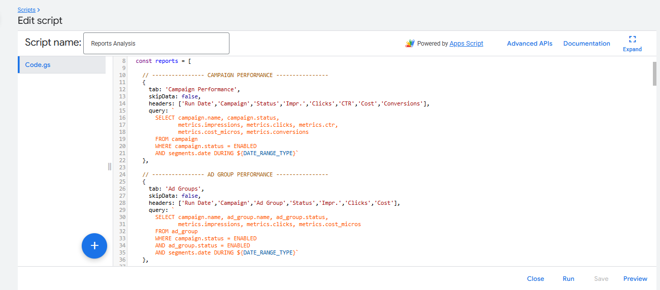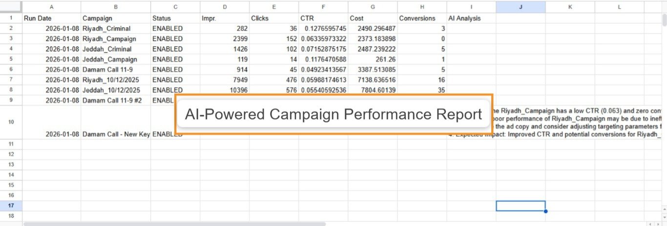 بنقرة واحدة من القائمة المخصصة "🚀 تحليل الذكاء الاصطناعي"، يكتشف السكربت أحدث البيانات عبر علامات تبويب متعددة - بما في ذلك أداء الحملة، مصطلحات البحث، والبيانات الديموغرافية.