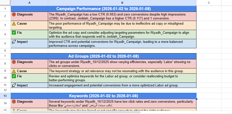 حوّل البيانات الأولية إلى نصائح استشارية احترافية على الفور. يدمج هذا السكربت جداول بيانات جوجل (Google Sheets) الخاصة بك مباشرة مع GPT-4o-mini من OpenAI لتحليل أداء حملتك الإعلانية خلال آخر 7 أيام.